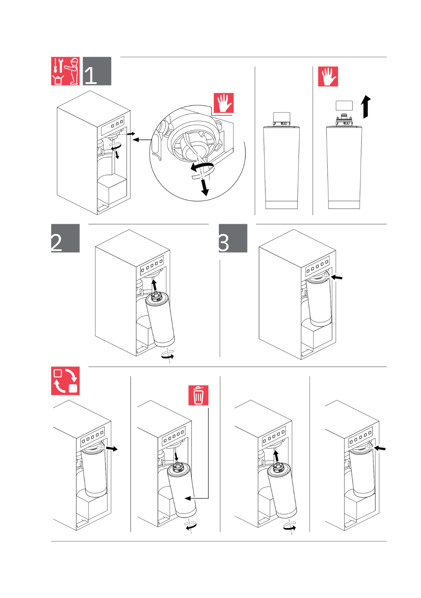 ⚠️ Let op: tijdens dit proces worden de kraanwatertoevoer en de kleppen van het uitgaande gefilterde water in de filterkop automatisch afgesloten. - Let op drukpieken: