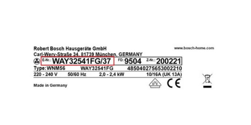 Het typenummer staat meestal in een code zoals WER12345, WAN28040NL, of vergelijkbaar. Dit nummer is nodig voor onderdelen, handleidingen of service.